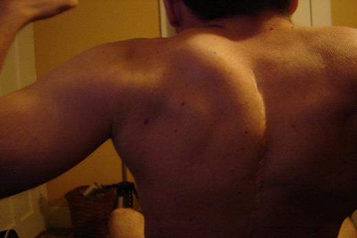 A little back posing. To explain the scar, yes, I had back surgery, but the surgery was years ago when I was a young teenager. Just showing off the back in a photo. It’ll take years ahead of me to get that Rambo look I want with the back, but I like what I see so far.