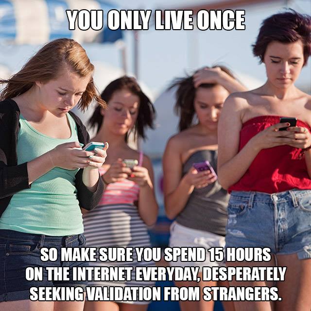 Back when I was young, there was no internet around. There was no such thing as social networking online back in the old days when I was a young teenager. To get validation and to socialize, we had to do that at school either that or go outside to make friends. That’s how it was in the old days but when these smart phones and Iphones started coming out, that’s when peoples lives started to change. These days people are getting their validation in social networking like FB, twitter, instagram, snapchat, etc. Where ever they do that stuff from. These days people have to bring their phones every where they go. It seems like their life is on social networking 24/7… they can’t stay away from it.