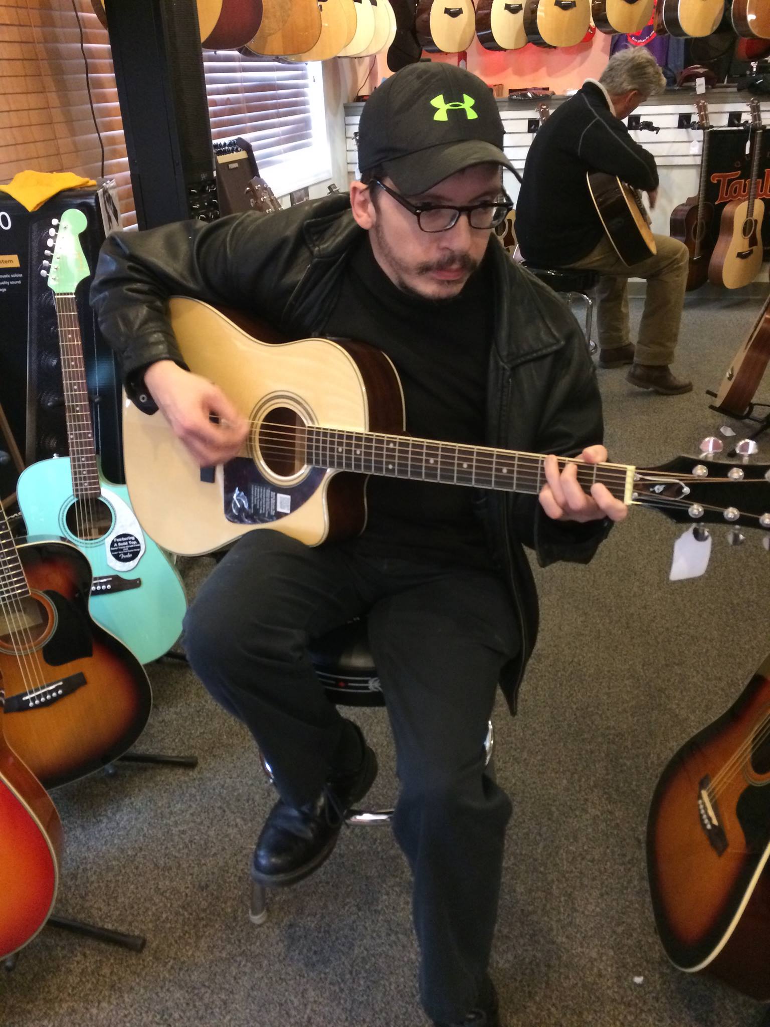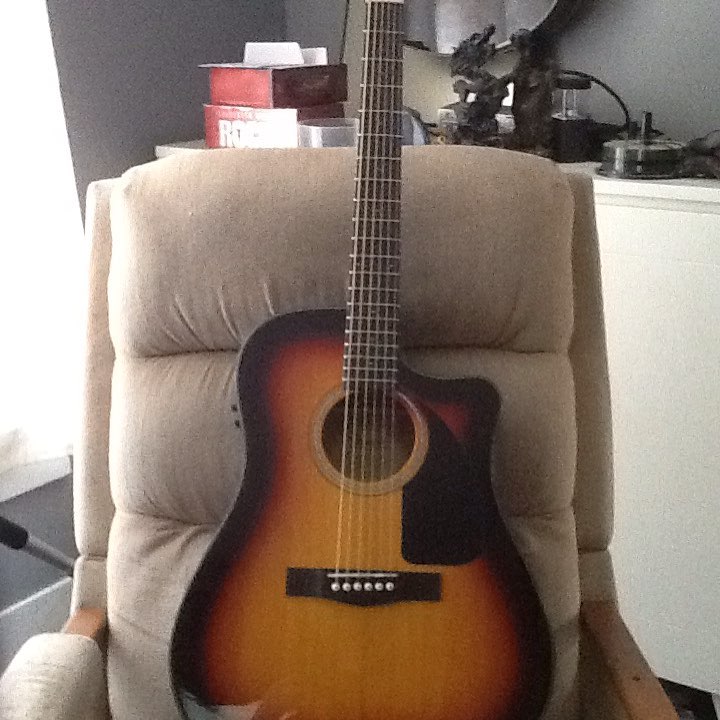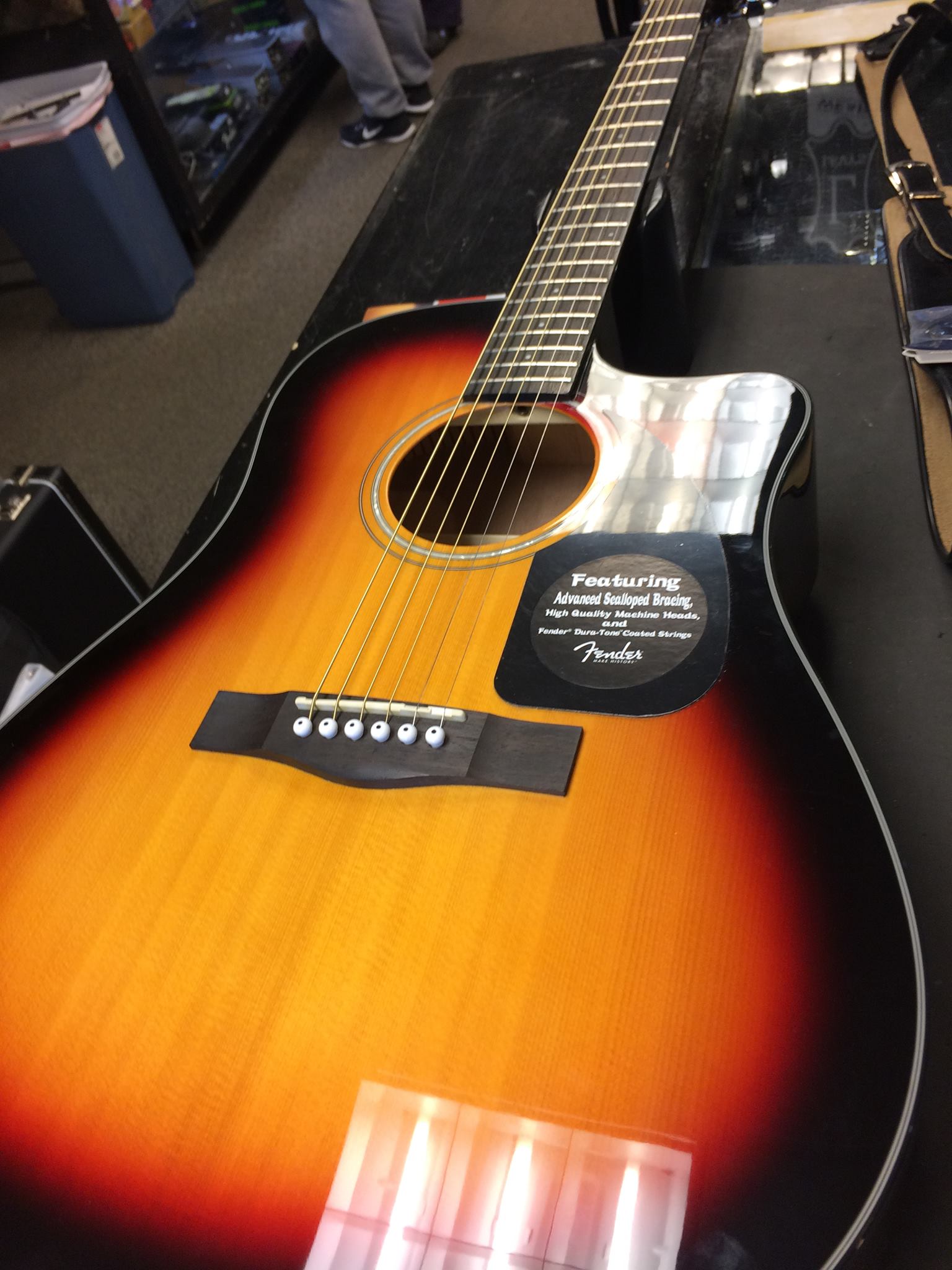 Well earlier today I went to a guitar shop in Clifton Park… a music store called, “Parkway Music”. The 1st pic above is me trying out different acoustics in Parkway. Then I found the one I am pretty happy with which I bought the guitar that’s in the bottom two pics. The guitar that I took home was a Fender acoustic/electric that costed me about $260. The guitar has volume controls on it and an onboard tuner as well.