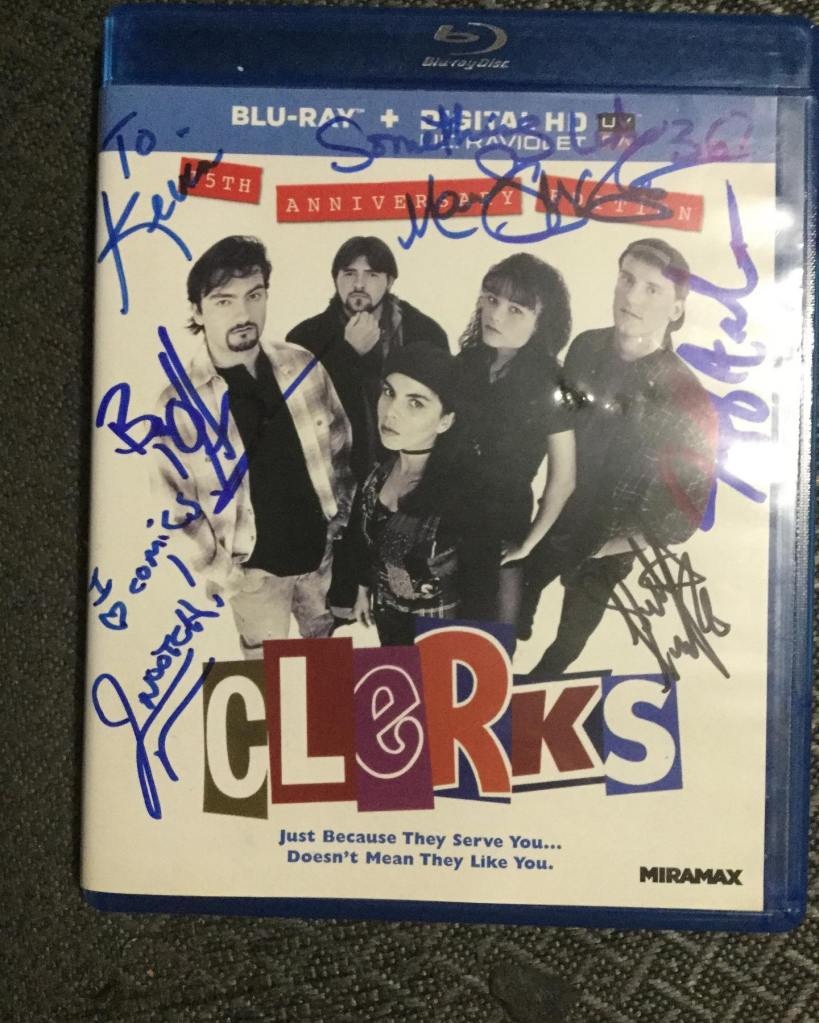 As you can see, I have this BluRay of the first “Clerks” movie autographed by most of the main cast. I got “everybody” pretty much except for the director Kevin Smith who also played Silent Bob and the woman who played Caitlin Bree. I can’t get the woman who played Caitlin to sign it… whose name is Lisa Spoonauer ’cause she passed away in real life a few years ago I think… so really the only cast member I need to get signed on this BluRay is Kevin Smith himself.
