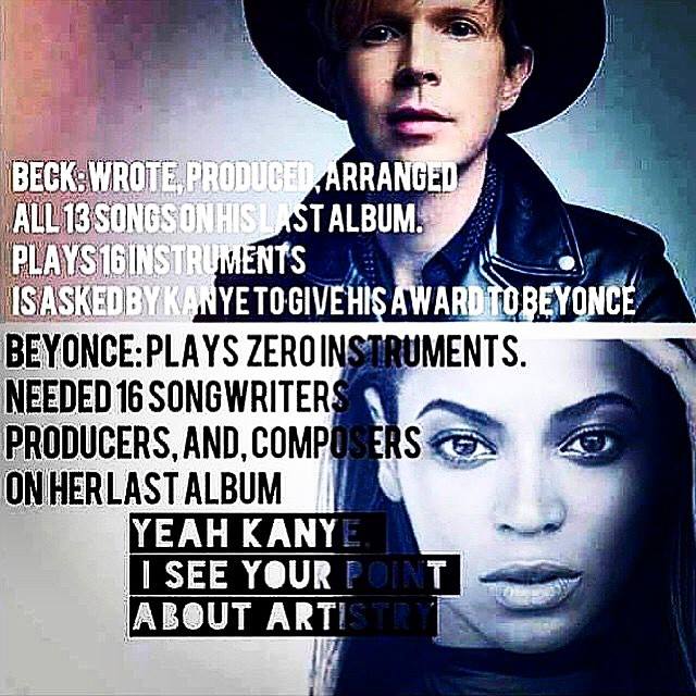 I wonder how Beyonce got where she is today? Oh that’s right, she got manufactured by record labels by getting her start through the R&B and pop group, Destiny’s Child. Beyonce only made 5 solo albums in her career and Beck have been making albums longer than her. Beyonce also had roles in a bunch of movies. Most of Beyonce’s music is all samples and the same beat throughout the whole song. She needed a bunch of songwriters and producers to help make her the music and Beyonce is considered an icon in today’s industry? Seriously?
